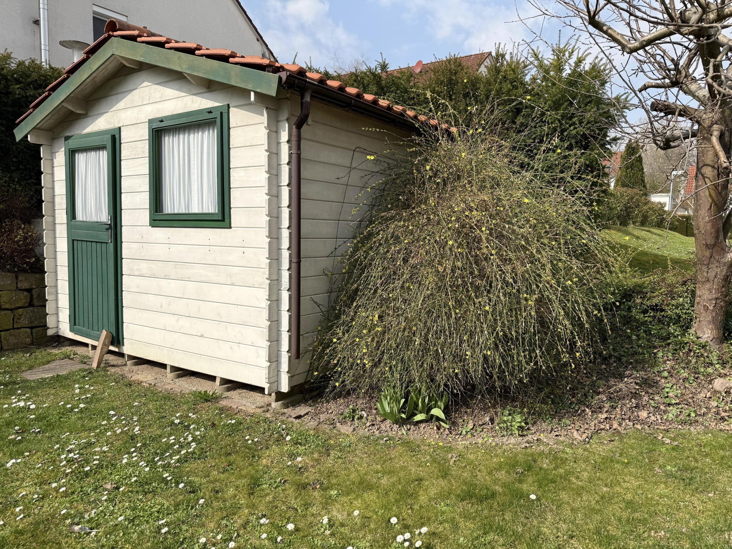 Auch der Außenbereich lässt keine Wünsche offen: Der liebevoll gestaltete Garten überzeugt mit einer Gartenhütte, einer natürlichen Steinmauer, gepflegten Wegen sowie verschiedenen Sträuchern und einer schützenden Hecke. Die moderne, überdachte Terrasse lädt zu entspannten Stunden im Freien ein. Eine Garage rundet das Angebot ab.